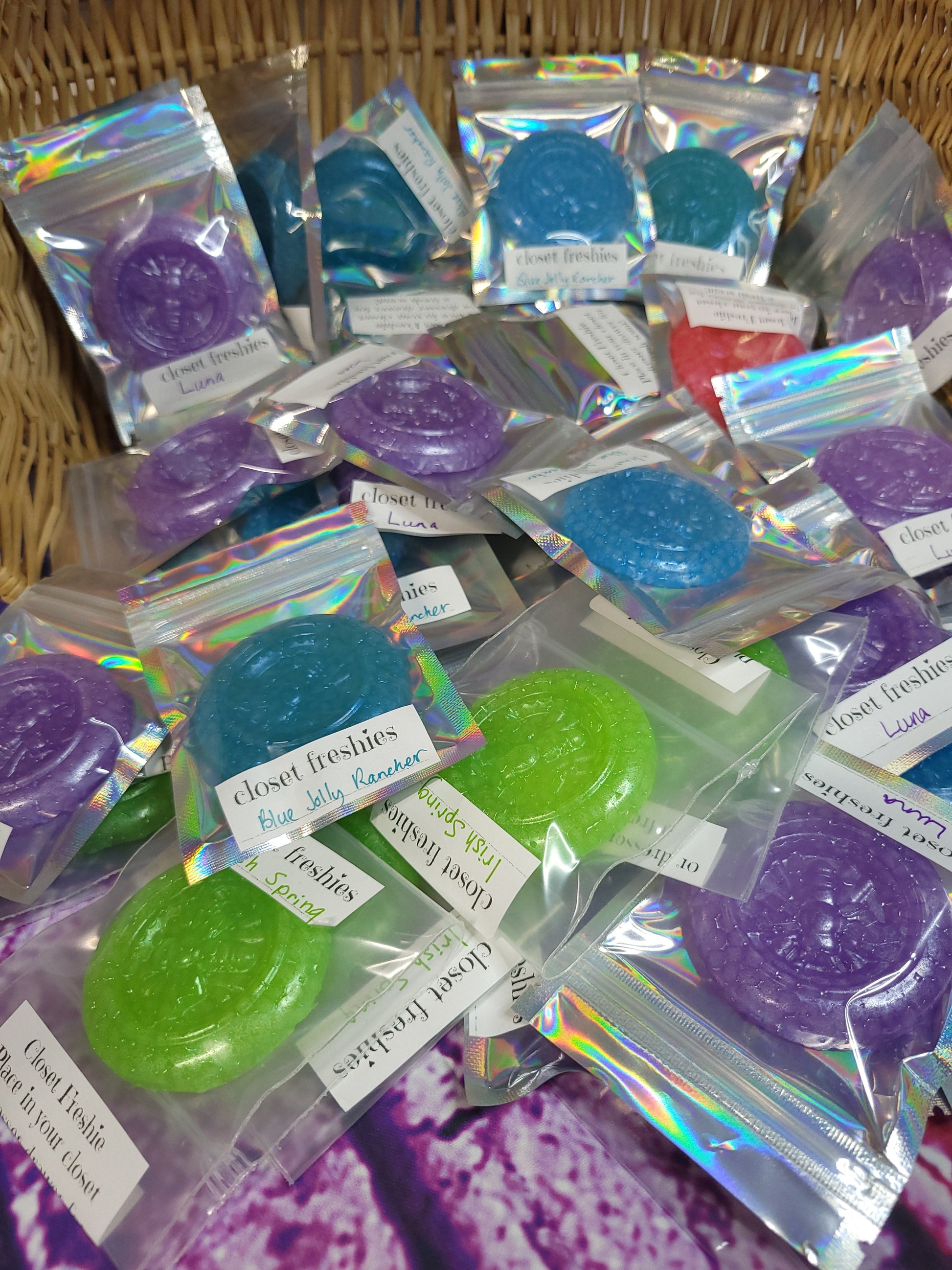 Closet freshies are smaller 2 inch round disk that can be use to freshen up small spaces like closets, bathrooms, dresser drawers, closets and trash cans. You can pop them inside bags or anywhere you want a clean fresh scent.