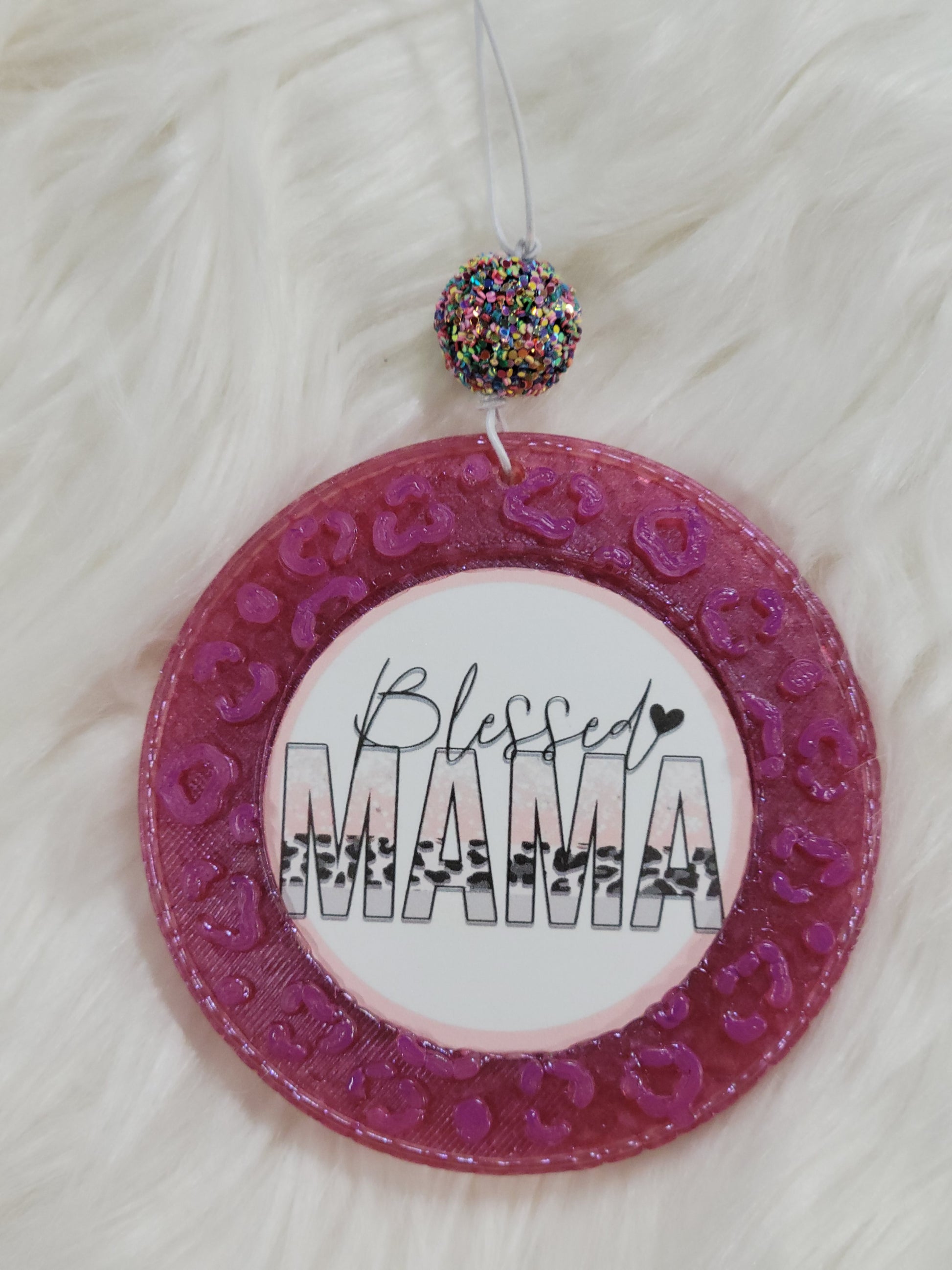 Blessed Mama 4 inch inset round cardstock freshie with leopard border